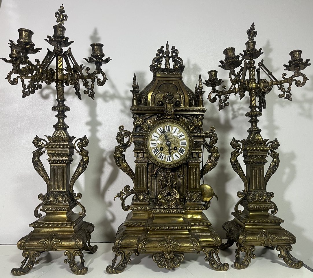 Espectacular conjunto de bronce formado por un reloj de sobremesa y dos candelabros gemelos. Este atractivo artículo es de fabricación francesa y data del siglo XIX.