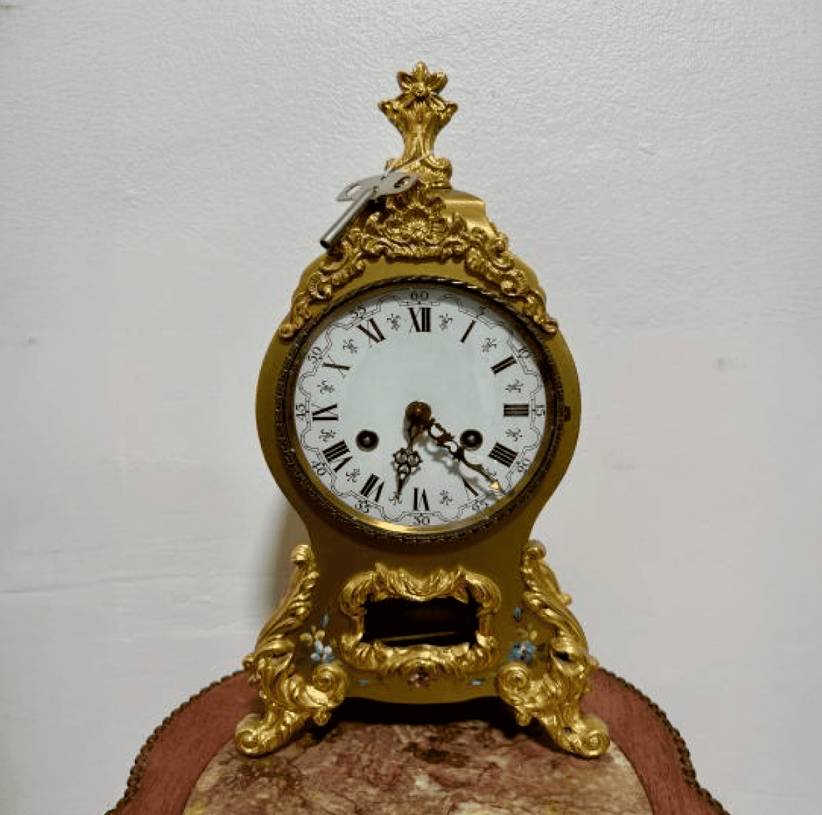 Elegante pieza en brillante bronce dorado, con esfera esmaltada blanca, decoración floral pintada a mano y movimiento de péndulo visible tras cristal. Funciona con llave (dos posiciones en la esfera). Compacto (≈25–30 cm) y perfecto para mesas, repisas o colecciones de relojería vintage.