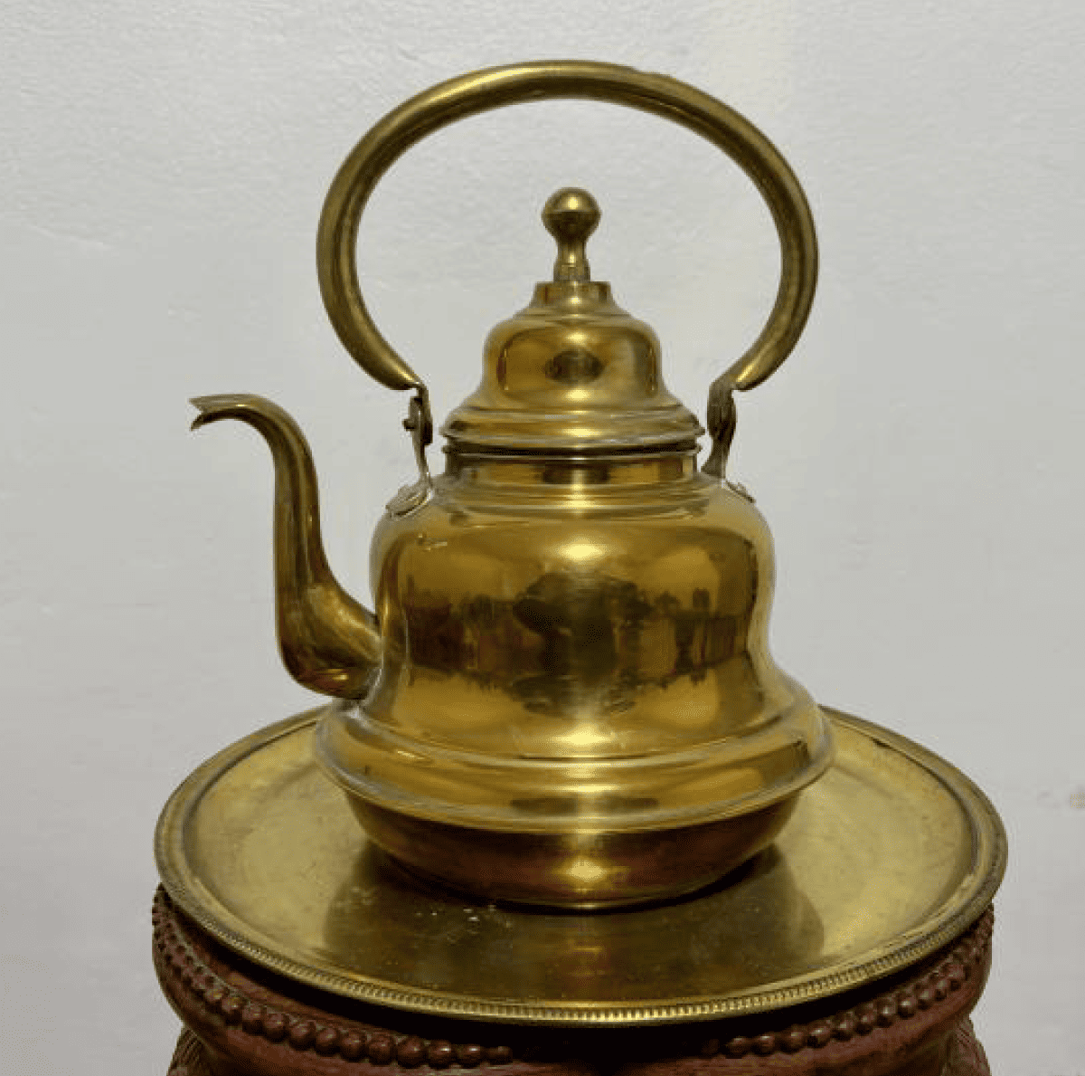 forma tradicional incluye un asa arqueada, pico vertedor fino y tapa ornamentada, todo sobre una bandeja también de bronce a juego. Es una pieza funcional y decorativa que evoca el estilo de épocas pasadas, ideal para coleccionistas o decoración vintage con carácter histórico.